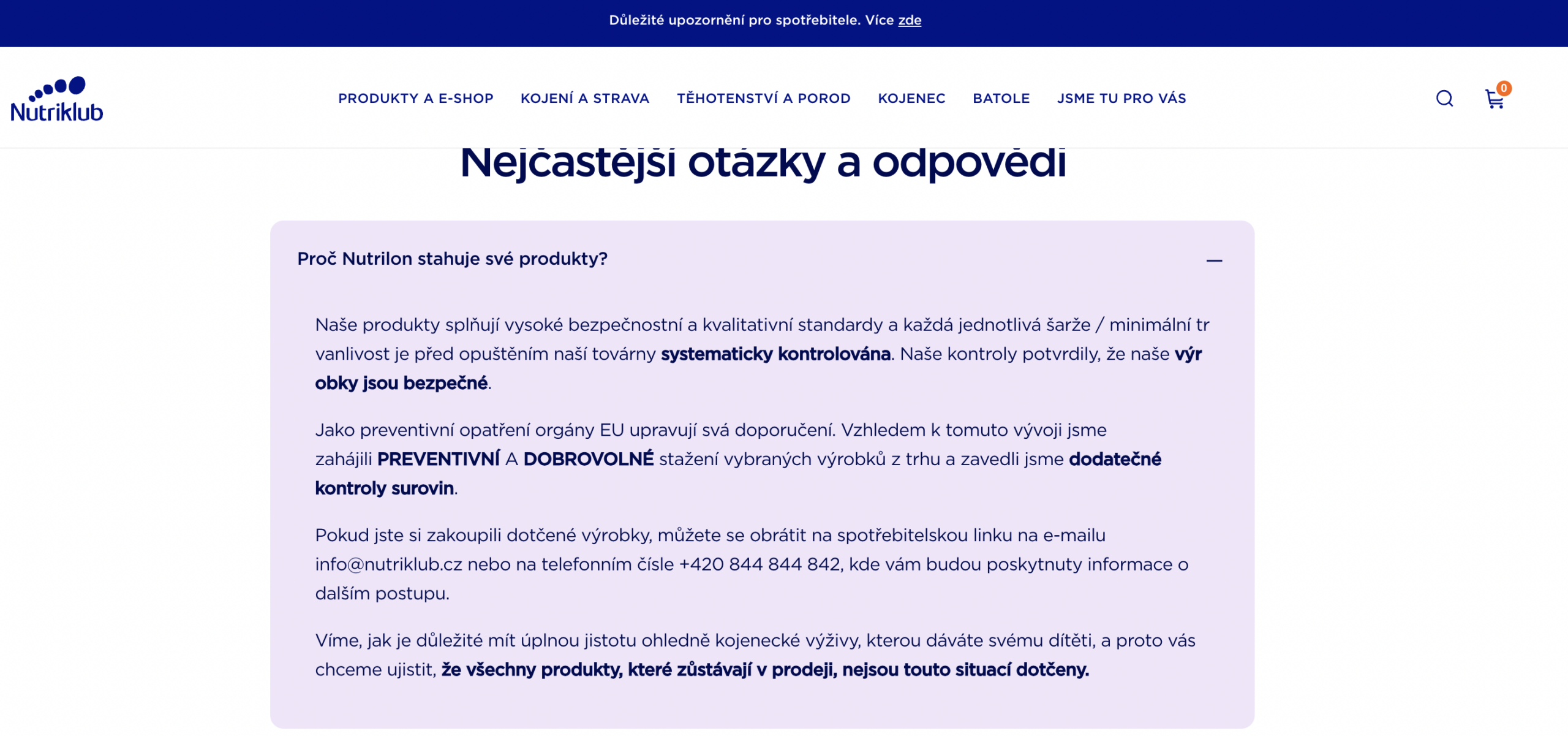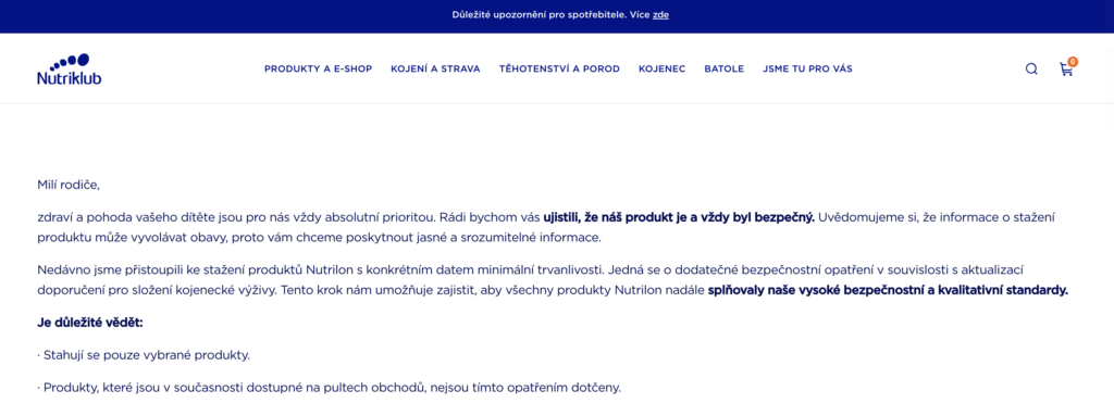 Stejně tak žádné specifické upozornění na další stahování nenajdete na webu Nutriklubu. Danone pouze nenápadně aktualizovalo předchozí oznámení z 5. 2. a nadále hovoří o dobrovolném a preventivním stahování, což zcela zjevně není pravda.