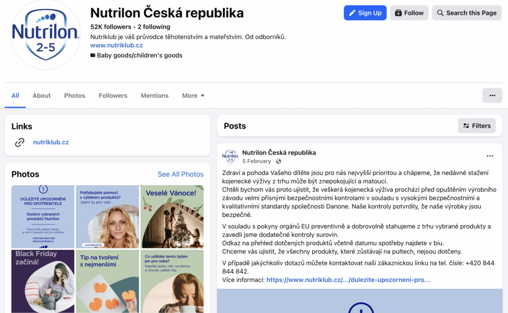 Stejně tak je zarážející, že společnost Danone dostatečně rodiče neinformuje ani na svých sociálních sítích. Poslední příspěvek na FB najdeme z 5. února 2026, kdy stahovali předchozí šarže Nutrilonu. Poté nastalo ohlušující ticho.