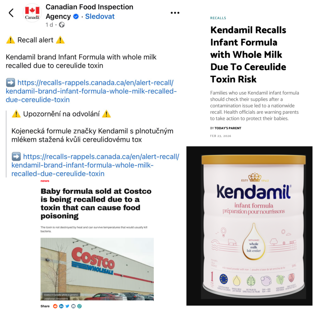 Po seznámení s aktuálními informacemi z Kanady upozorňujeme, že tam byly z trhu staženy dvě konkrétní šarže počáteční výživy značky Kendamil kvůli možné kontaminaci toxinem cereulidem.